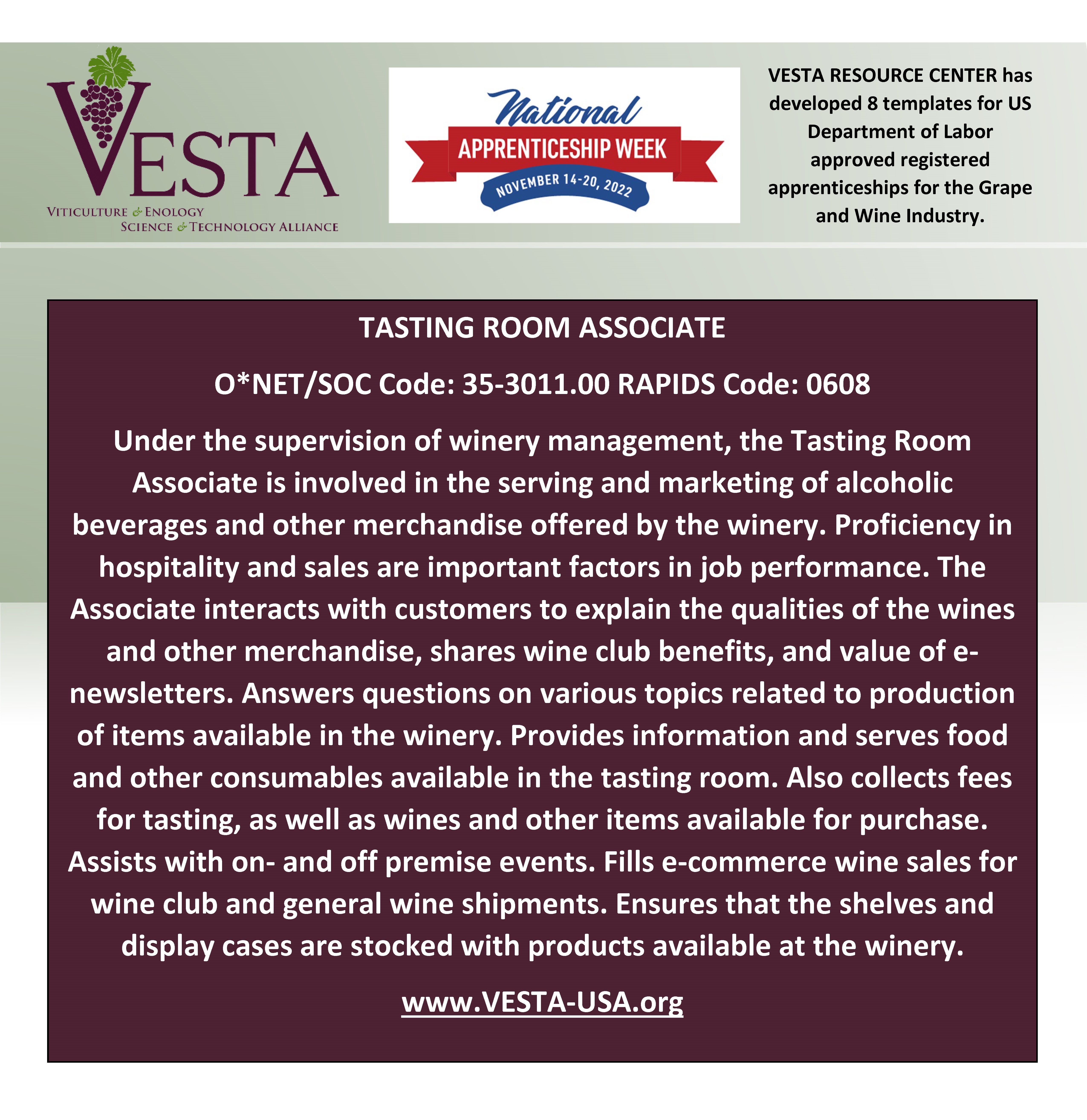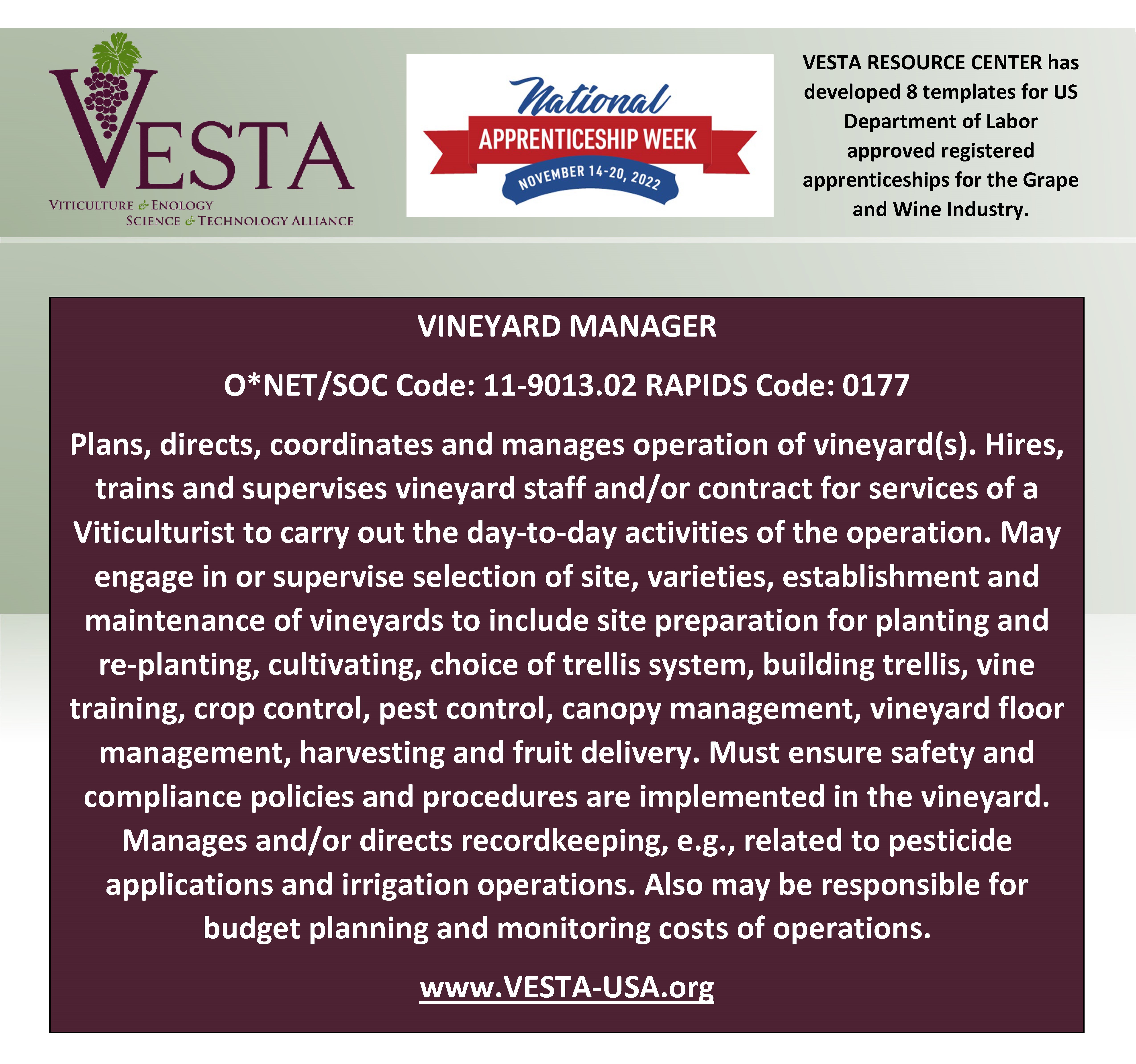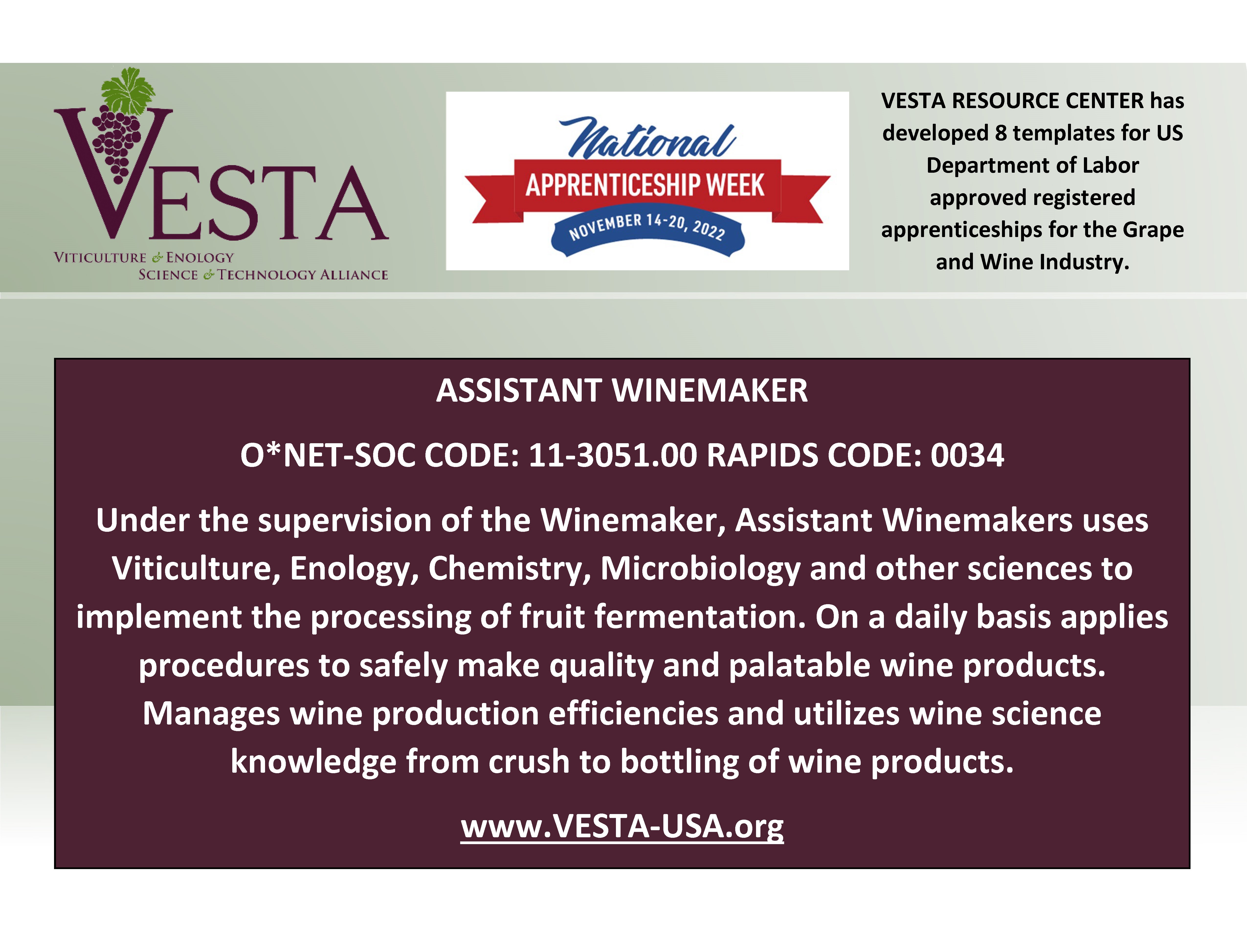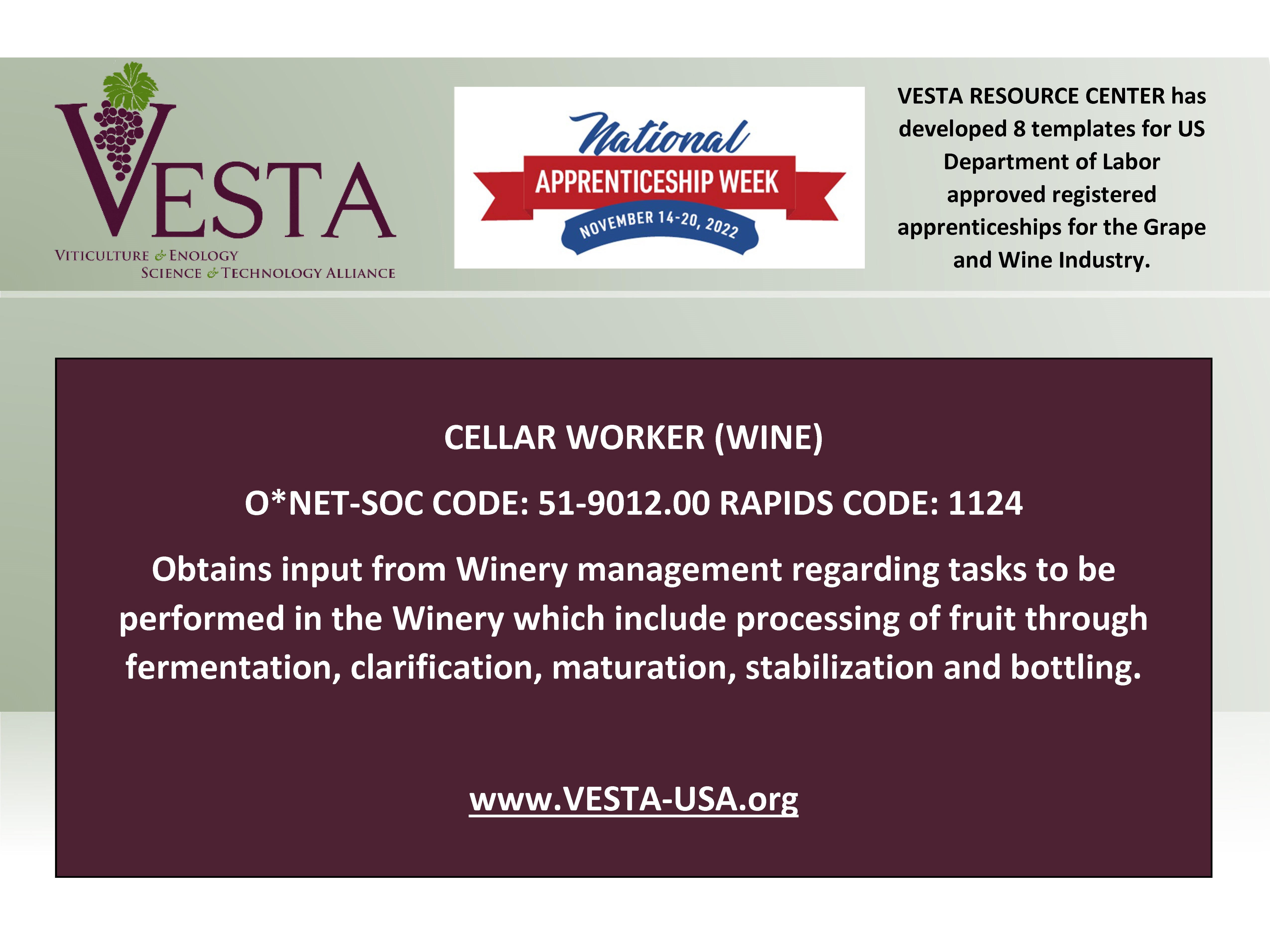 Deadline to Register for VIN 212 Winter Viticulture TechnologyNational Apprenticeship Week is November 14-20, 2022. It is also the 85th anniversary of Registered Apprenticeship Act Celebrate with VESTA and the US Department of Labor.