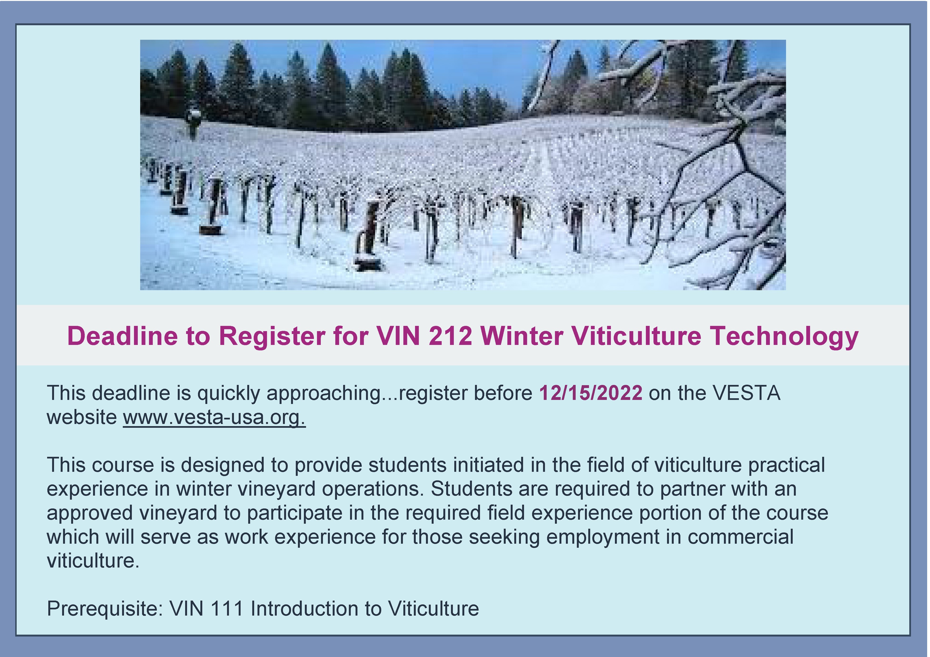 | VIN 212 | Winter Viticulture Technology | Credit: 2 | Practicum: 32 hours |