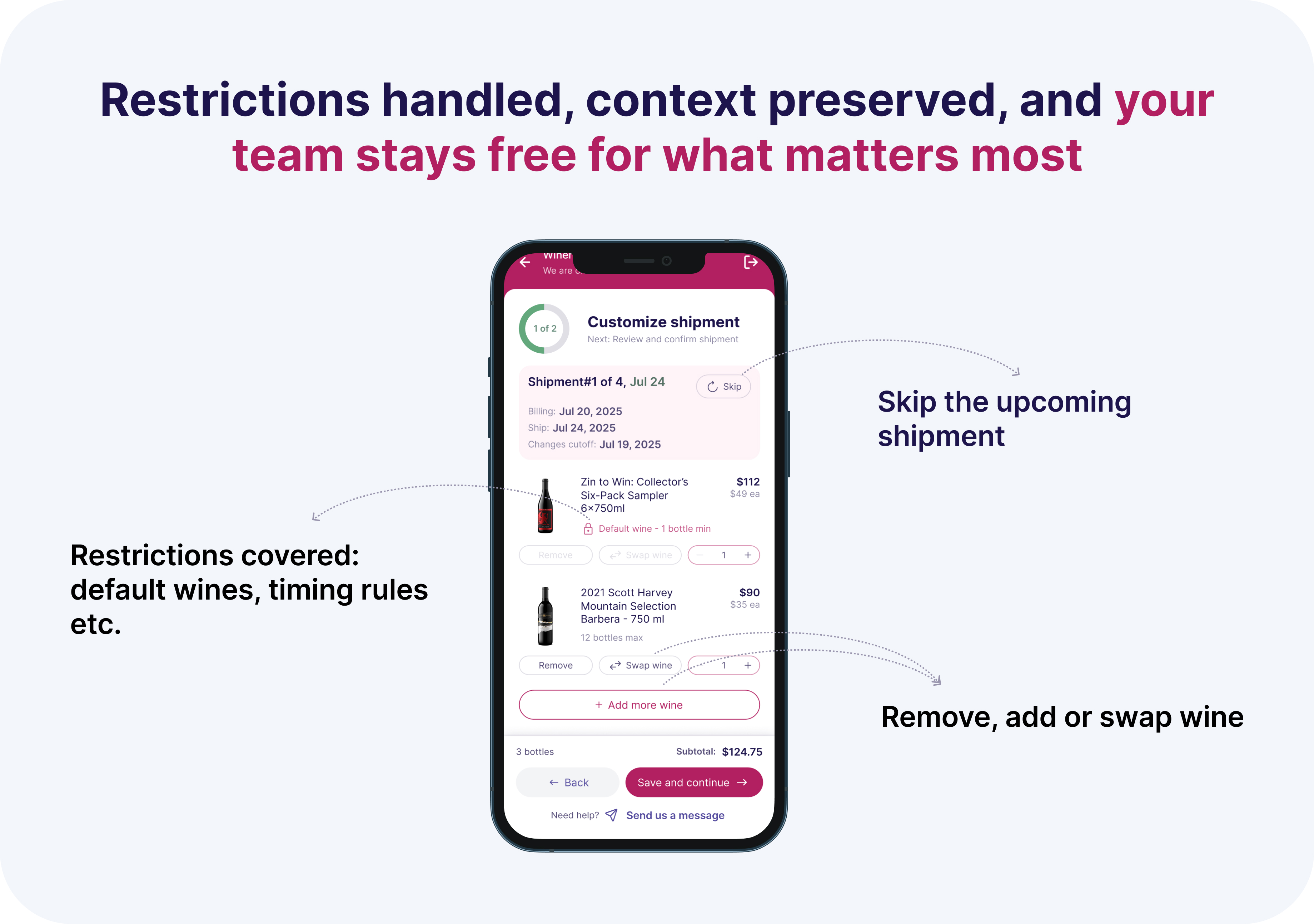 Wine club flexibility drives retention — but for many wineries, giving members the freedom to change wines before a shipment often comes at the cost of time, stress, and manual work.
