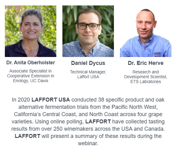 Join Daniel Dycus from Laffort USA and guest speakers Dr. Anita Oberholster from UC Davis and Dr. Eric Herve from ETS Labs for the first webinar in a series Dealing with Smoke Taint. In 2020 Laffort USA conducted 38 specific product and oak alternative fermentation trials from the Pacific...