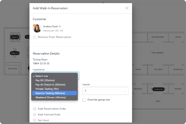 Walk-in Reservations Add a walk-in reservation directly from the property map. Click on any table that doesn't already have a reservation to create one. Optionally attach a customer, select the reservation type, and adjust the start time if needed. You'll be prompted for payment if required for the...