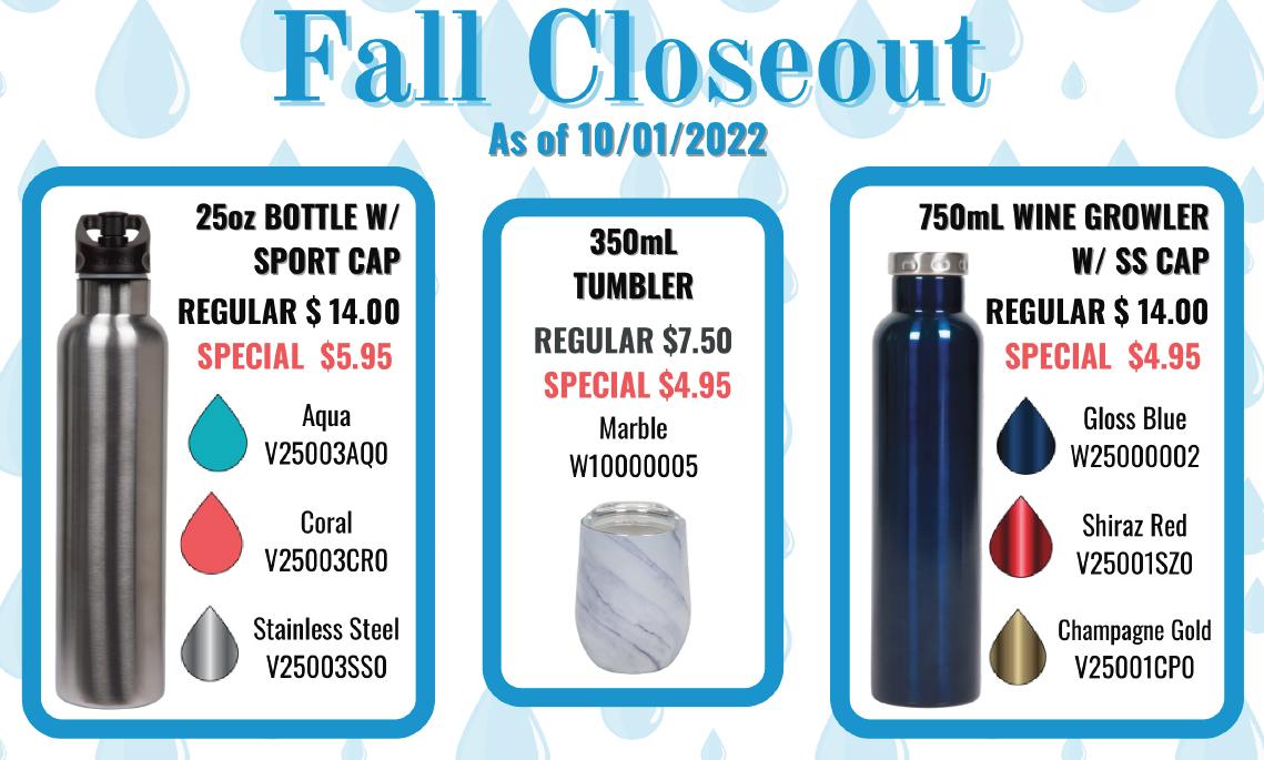 With Harvest in the rear-view mirror and the wine making process in full effect, it's time to think of your Wine Club and Employee Gifts for the Holidays. So, take advantage of our: Growler + Tumbler Closeouts Buy 12 Get 3 Free Marble Ornaments Free Freight 'til 10/31 Stainless Steel Wine, Coffee...