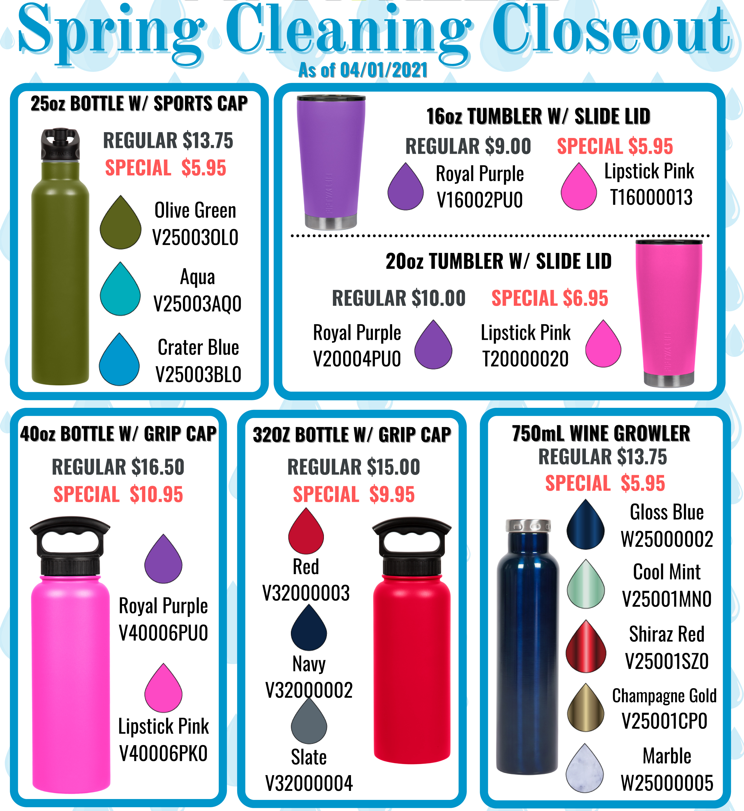 They won't last long, so get the 750ml or 25oz Wine Growlers while they're hot - or before it gets too hot! Why not have us laser engrave your custom logo? It's just a 24-piece minimum and they will deliver to you in less than 3 weeks. Fun colors for Spring and a good excuse for your customers to...