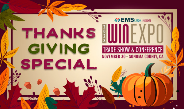 A Special Thanksgiving Holiday Offer! Take advantage of EVENT SAVINGS all week long! Register between NOW & Cyber Monday with the promo code "THANKFUL" and get access to the trade show and $30 off conference sessions! The Expo has become THE year-end event for North Coast wine industry...