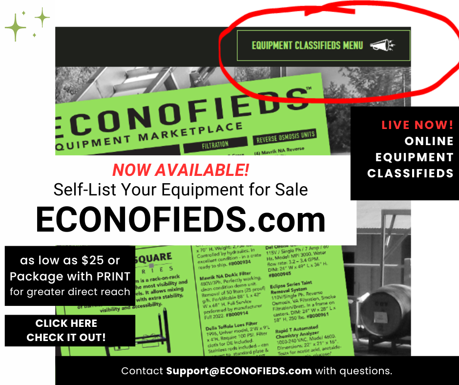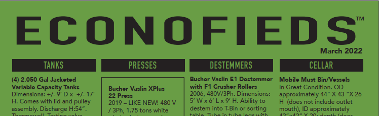 We are happy to announce ECONOFIEDS.com has a very affordable online equipment classifieds listing portal on the site. For as low as $25 you can list equipment for 2 months. For a bit extra your equipment can go into the Printed Mailers we send to over 3100 wineries. Check out Econofieds.com to...