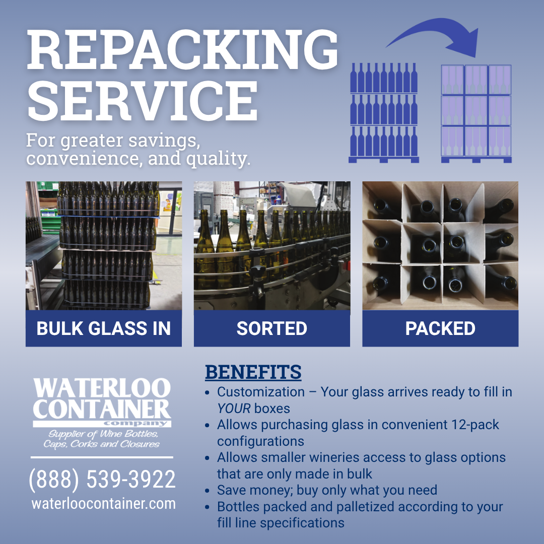 Need glass packed your way? We’ve got you covered. Our repack service means you don’t have to buy more than you need or settle for the wrong case setup. We’ll take bulk glass and repack it into custom 12-pack boxes (or whatever works best for you), palletized and ready to go. It’s fast, flexible,...