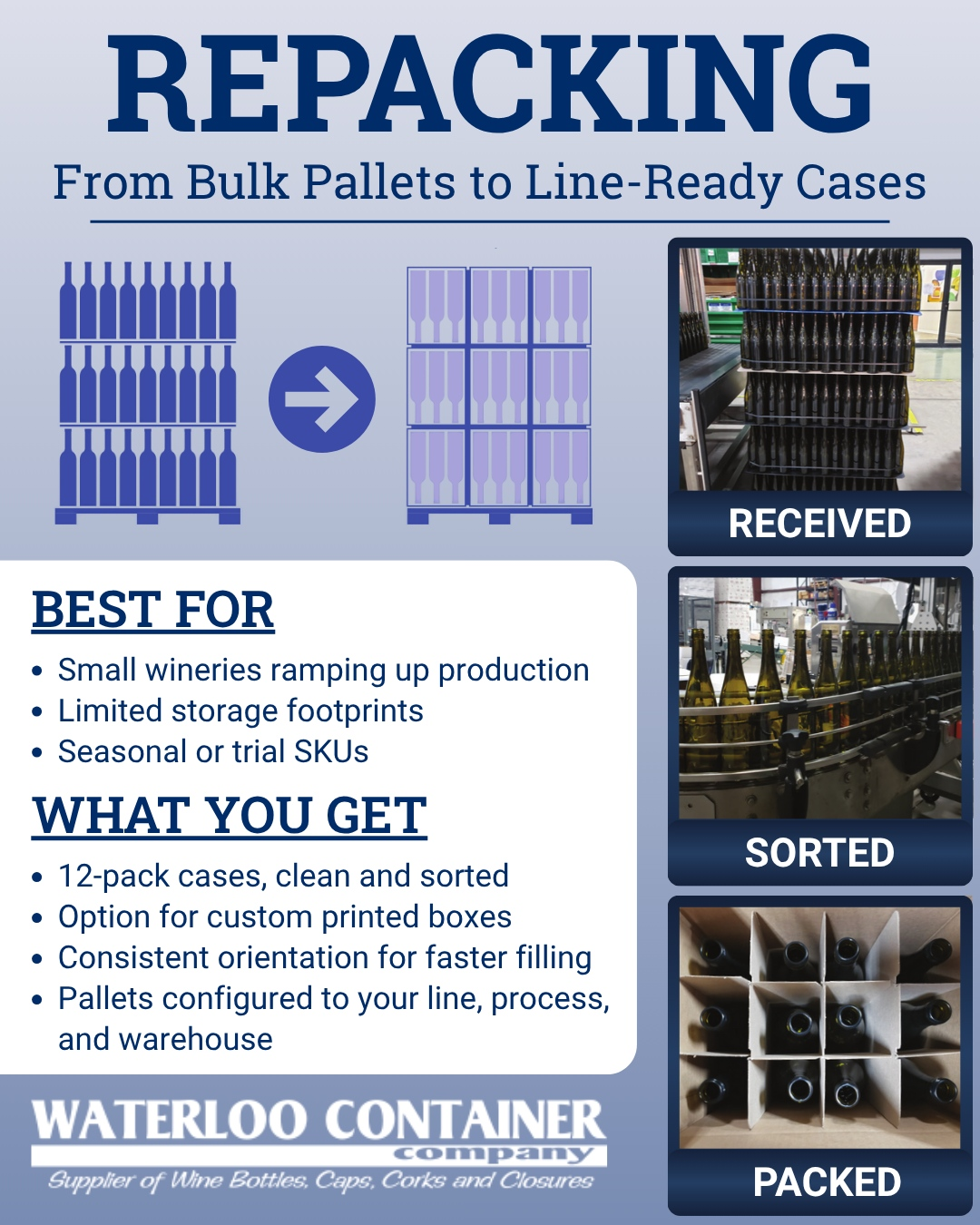 From bulk pallets to line-ready cases, our repack services make it simple. Bottles are depalletized, inspected, packed into cartons—including custom printed boxes produced right here at Waterloo Container—then palletized for delivery or warehouse storage. Whether you need full automation or...