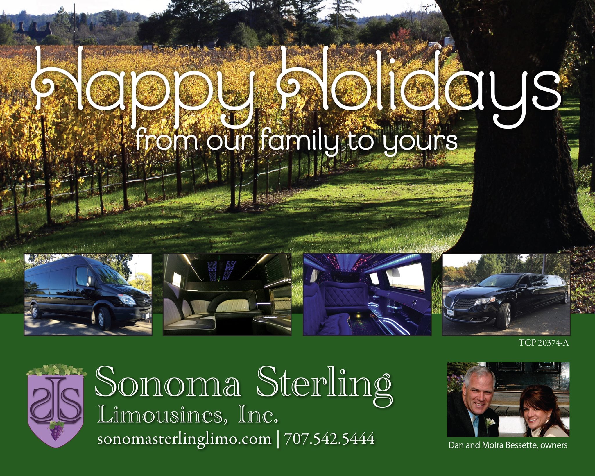 We would like to take this opportunity to wish our valued clients, colleagues and associates a very joyous Holiday Season. We appreciate your support and look forward to providing you with exceptional service in the coming New Year. Team Sonoma Sterling www.SonomaSterlingLimo.com