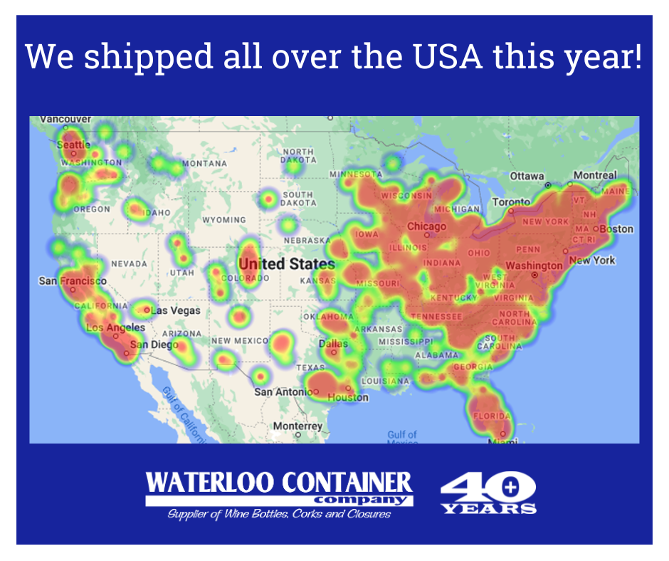 Our Fast Ship team can get your less-than-pallet order out the door quickly! Look where we have been in 2024! With low MOQ's we serve all sizes of wineries! Call to place your order and let our team plan the shipping for you! Visit https://www.waterloocontainer.com/faqs/ to learn more!