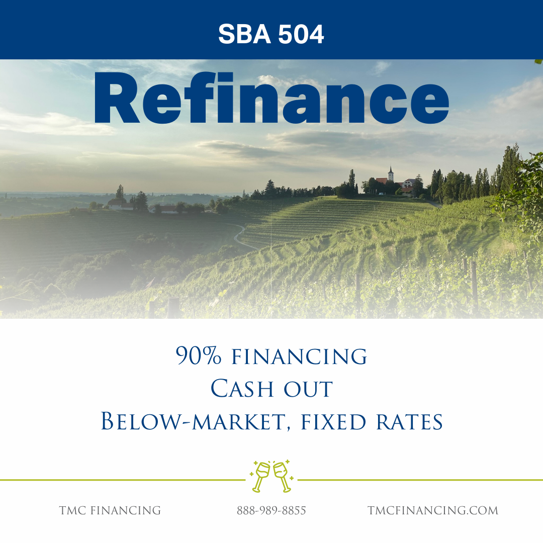 Refinance Your Winery or Vineyard with the SBA 504 Loan Program: Here's Why! Attention winery owners! Discover the benefits of refinancing with the SBA 504 Loan Program: Financing up to 90% of the appraised property value. For cash-out projects, up to 85% financing is available. Cash out up to 20%...