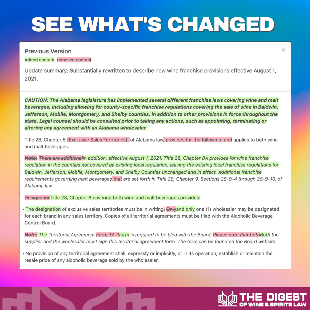At the Digest of Wine & Spirits Law, we know it's important for our subscribers to know when information changes that applies to their business. In addition to updates, subscribers can see specific changes at a glance by using the “Compare” function: just one click shows what text has been changed,...