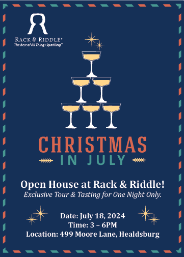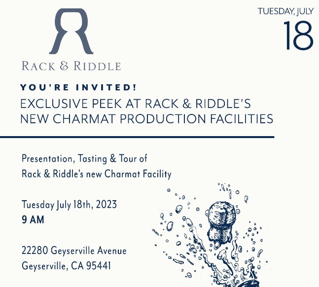Presentation, Tasting & Tour of Rack & Riddle’s new Charmat Facility Trade & Press please RSVP by July 14th to monica@rackandriddle.com Tuesday July 18th, 2023 at 9am 22280 Geyserville Avenue, Geyserville CA 95441 9AM – Welcome, Coffee & Pastries 9:30AM – Presentation & Tasting with Manveer Sandhu...