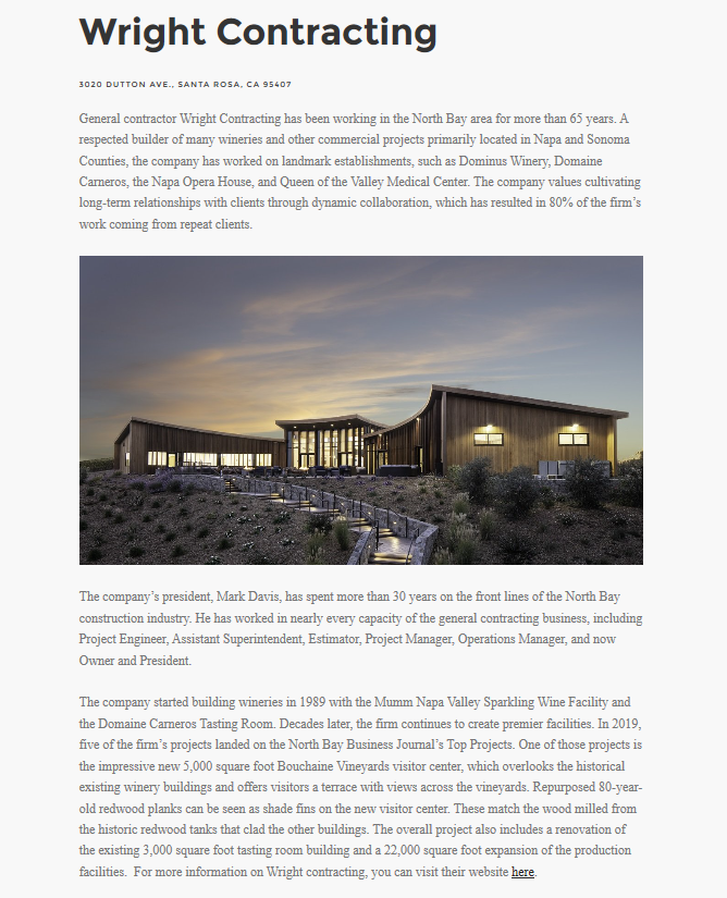 Wright Contracting was recognized among the best winery contractors in the United States by General Contractors Magazine. An excerpt from the article reads “The art of building wineries involves blending brand expression, a welcoming customer experience, high practical functionality, and...
