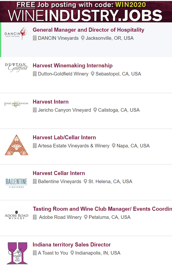 Harvest Interns, General Manager & Director of Hospitality, Tasting Room & Wine Club Manager / Events Coordinator, Sales Director See more at www.Wineindustry.Jobs