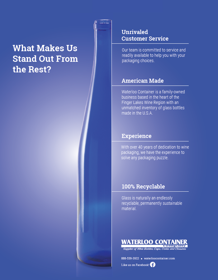 At Waterloo Container Inc. our mission is to produce and provide quality glass bottle packaging that exceeds our customers expectations. We are your one stop shop proudly serving the Wine Industry. Find out more at waterloocontainer.com or by calling 888-539-3922. Visit us online at...