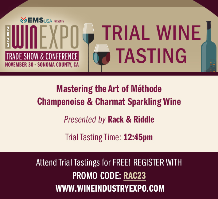 Rack & Riddle Presents: Mastering the Art of Méthode Champenoise & Charmat Sparkling Wines WIN Expo Exhibit Hall Trial Tasting Thursday, November 30 12:45 – 1:45 p.m. Sonoma County Fairgrounds Grace Pavilion 1350 Bennett Valley Rd., Santa Rosa, CA 95404 Join Rack & Riddle for a tasting...