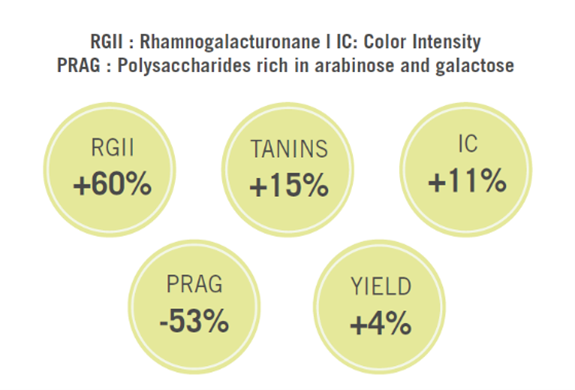 Each grape has its own intrinsic phenolic potential (anthocyanins, tannins) that determines the color and structure of the future red wine. This phenolic potential depends on different factors such as varietal, grape growing conditions, fruit’s maturity, and health conditions. Anthocyanins, responsible of red wine color, are small, water-soluble, and easily extracted. They are highly unstable and able to react fast with other wine compounds resulting in loss of color. Tannins, essential in stabilizing anthocyanins, are typically ethanol-soluble, and so are extracted later in the fermentation. The smallest tannins can be extracted easily, while larger tannins require physical breakage of berry skin cells to allow diffusion into must. Likewise, polysaccharides, which also have a role to play in color stability, get extracted with ethanol formation. In the early part of fermentation, we have abundant anthocyanins with insufficient tannins and polysaccharides to chemically stab